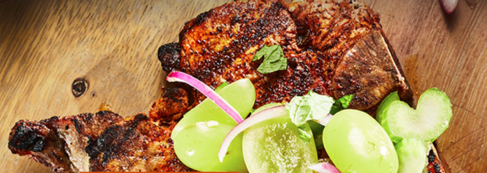• Pasa las chuletas a un plato y deja reposar durante unos 5 minutos. Rebana y sirve con la ensalada de uva y comino.