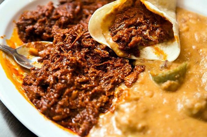 • Una vez que la carne esté lista, ponla en un recipiente junto con el caldo. Cuando se enfríe, desmenúzala usando dos tenedores.