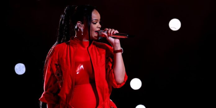 Envuelta en un traje rojo la cantante Rihanna apareció en el medio tiempo del Super Bowl. La gran sorpresa, una Rihanna embarazada haciendo tributo a grandes iconos de la moda. Durante su presentación de 13 minutos la cantante hizo un recorrido por sus grandes éxitos y confirmó los rumores de que estaba por darle un hermano a su hijo de 9 meses.